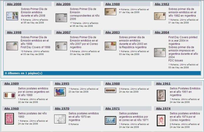Cada una de éstas dos categorías, cómo así también la categoría de cada país se divide a su vez en "Albums" pertenecientes a cada año de emisión, del sello postal, el entero ó el sobre. Cada imagen de sello postal ingresada tendrá dentro de lo posible, los siguientes datos: