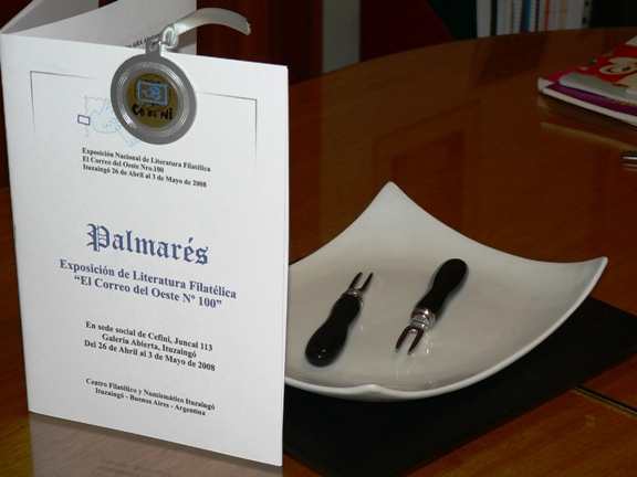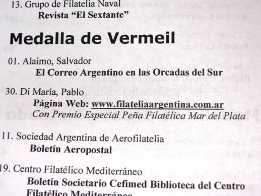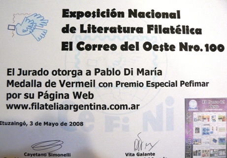 En el marco de la Exposición de Literatura Filatélica " El Correo del Oeste Nro 100 " , el sitio web http://www.filateliaargentina.com.ar ha sido premiado con medalla de Vermail y "Premio Especial Peña Filatélica de Mar del Plata" . Quiero agradecerles a todos, haberme dado la oportunidad de participar de la Exposición. La Exposición se realizó desde el 26 de Abril del 2008 hasta el 3 de Mayo de 2008, fecha en la cual el jurado integrado por : Dr Eliseo Rubén Otero Presidente de la FAEF Sr Orlando Eloy Corres Dra Vita Galante de Fernández Jurado Consultor: Ing Néstor M. Ferré luego de leer el Acta, realizó la entrega de premios. La lista de premiados es extensa en cada categoría, las ´dos medallas de Oro las recibieron, la "Fundación Bose" por la Revista Fundación Bose y el Centro Filatélico Argentino Israelí por la Revista CEFAI Luego se entregaron las Medallas de Vermail Grande, las Medallas de Vermail, las Medallas de Plata Grande, las Medallas de Plata, las Medallas de Bronce Plateado, las Medallas de Bronce y los Premios Fuera de Concurso