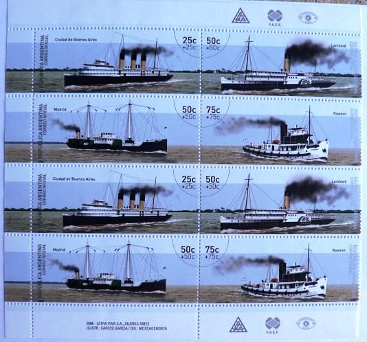 Serie de 4 Barcos de la Marina Mercante Argentina Buque Ciudad de Buenos Aires Vapor Lambaré Buque Motor “Madrid” Aviso “Rawson” Serie emitida el 19 de Agosto de 2006