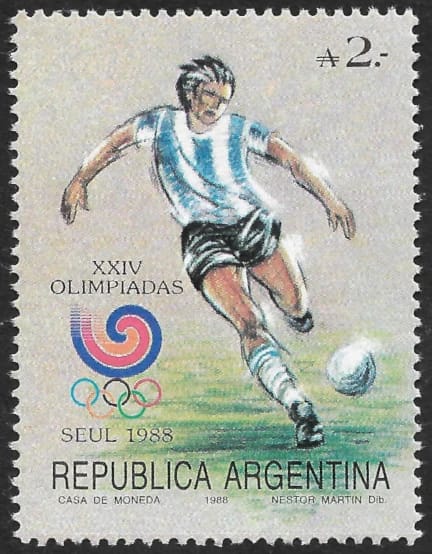 Serie de 5 Sellos Postales con Viñetas alegóricas a los siguientes Deportes – Disciplinas: Fútbol Tenis Hockey Atletismo Deportes en los cuales Argentina tuvo participación en los XXIV Juegos Olímpicos de Seúl 1988.